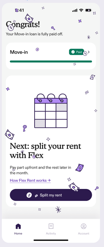 If you paid your move-in costs through Flex—either by paying in full or by completing a pay over time plan—you may be able to sign up for Flex Rent, based on eligibility. Flex Rent makes rent payments more manageable by letting you split your rent into smaller payments with a credit line, while also helping you build credit history.